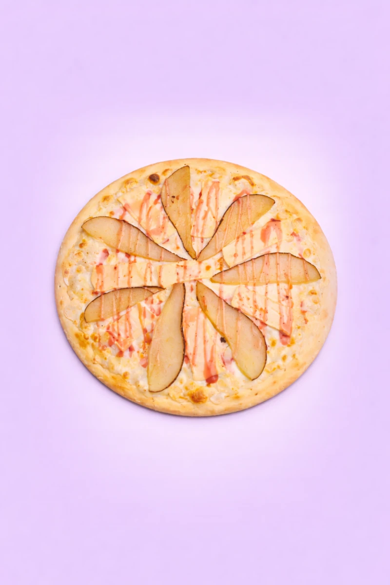 Нежная сливочная пицца с тягучей моцареллой, ароматной грушей и мягким сыром камамбер. Дополнена соусом из брусники — утончённый сладко-сливочный вкус с лёгкой кислинкой.