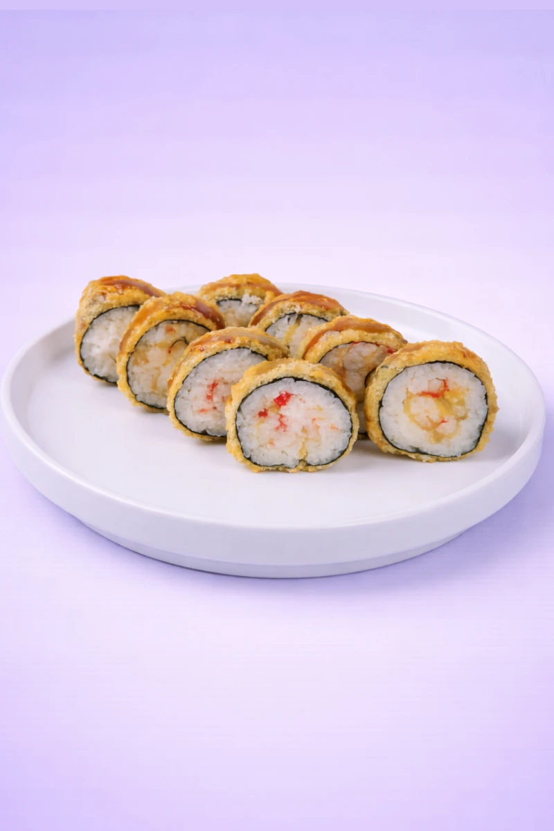 Горячий темпура-ролл с сочной креветкой, авокадо и сливочным сыром, обжаренный в хрустящем кляре и сухарях. Украшен красной икрой и сладким соусом чили — яркий, сочный и аппетитный вкус.
