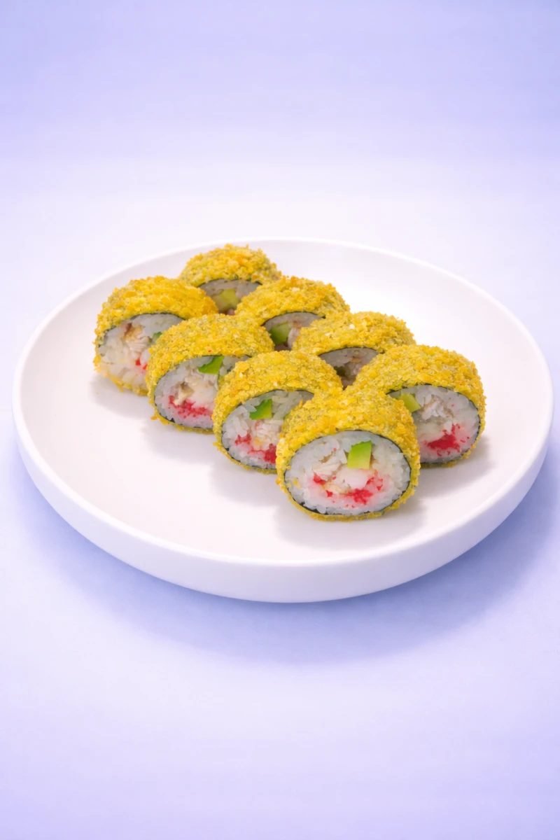 Хрустящий темпура-ролл с угрем и креветкой, с добавлением икры масаго и авокадо обжаренный в золотистом кляре с сухарями.